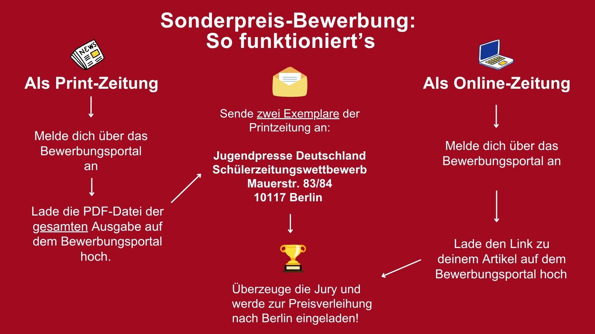 Die Bewerbung auf einen oder mehrere Sonderpreise könnt ihr ab dem 15.10.2025 über unser Bewerbungsportal wettbewerb.schuelerzeitung.de einreichen.